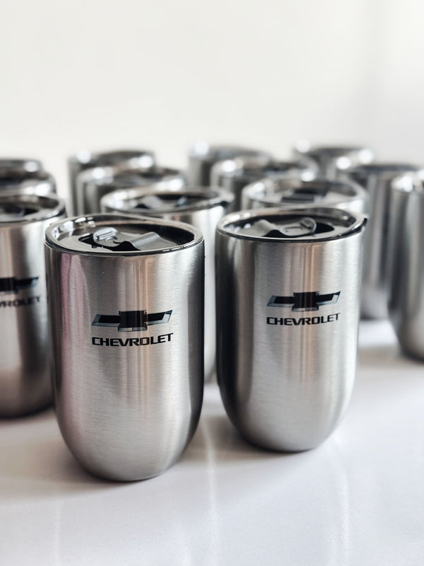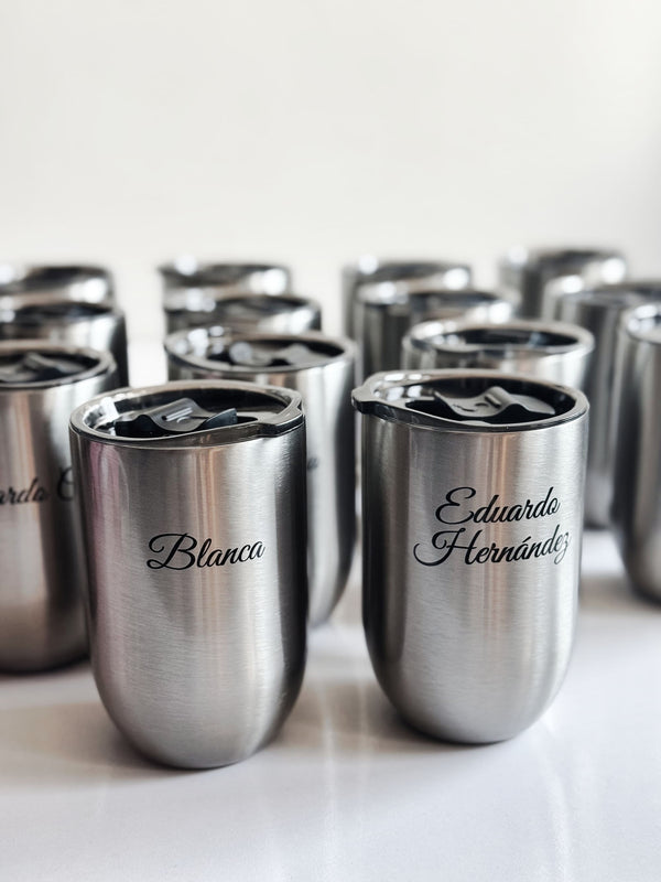 Además, desarrollamos promocionales corporativos como copas sin tallo fabricadas en acero de doble pared en acabado plata, personalizadas con nombre y logotipo, pensadas como piezas de reconocimiento y pertenencia.